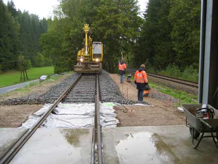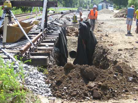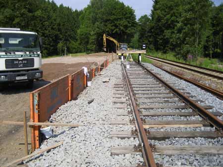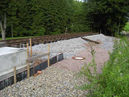 | 4. Juli 2006: Einbau der Rigolenversickerung. Neben der Gleisentwässerung wird auch das Regenwasser vom Dach hier versickern. | ||