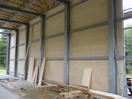 | 8. September 2006: Die Stahlkonstruktion wird mit Schichtholzplatten verkleidet, welche gleichzeitig die Innenwände bilden. | ||