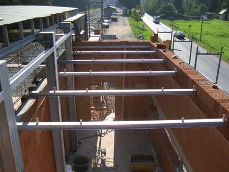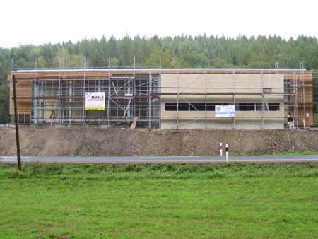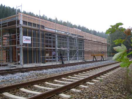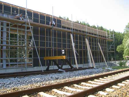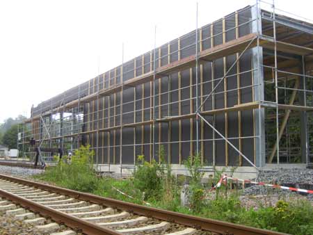 | 8. September 2006: Blick vom Streckengleis auf die neue Halle. Hier wird gerade die Unterkonstruktion für die Lärchenholzverkleidung angebracht. | ||