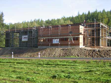 | 21. September 2006: Auf der Straßenseite beginnt das Anbringen der Lärchenholzverklei-dung sowie das Verglasen der Fensterfront. Die Maurerarbeiten am Nebengebäude sind abgeschlossen. | ||