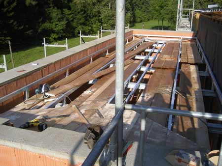 | 21. September 2006: Die Dachkonstruktion des Nebengebäudes ist aufgesetzt. Nun beginnen die Verschalungsarbeiten. | ||