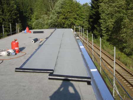 | 25. September 2006: Nachdem die Klempnerarbeiten abgeschlossen sind, wird nun das Dach der Halle mit der zweiten Lage Dachpappe versehen. | ||