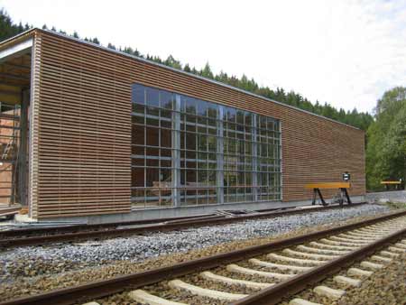 | 29. September 2006: Nach Abschluß der Arbeiten an Dach und Fassade konnte das Gerüst auf der Gleisseite bereits abgebaut werden. So wird sich die neue Fahrzeughalle den Fahrgästen der Müglitztalbahn künftig präsentieren. | ||
