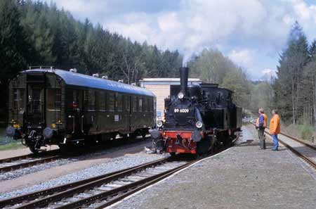| 1. Mai 2008: Anläßlich des 10jährigen Vereinsjubiläums fand in Bärenstein ein Bahnhofsfest statt. Altenberger Wagen und die Dresdner 89 6009 stehen vor der Fahrzeughalle. | ||