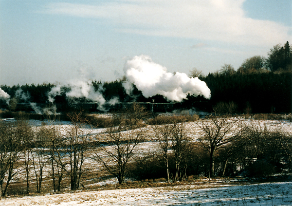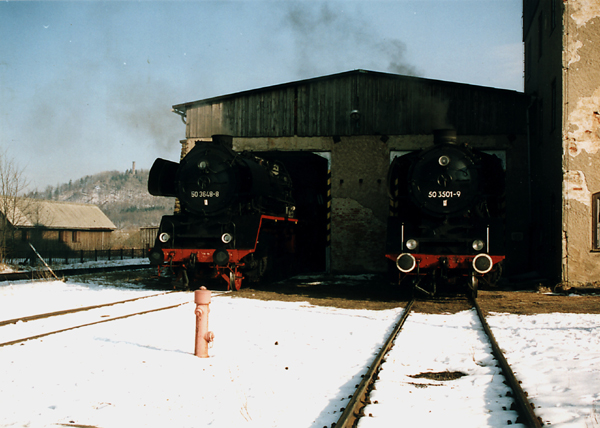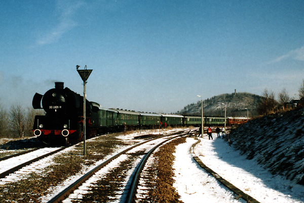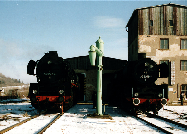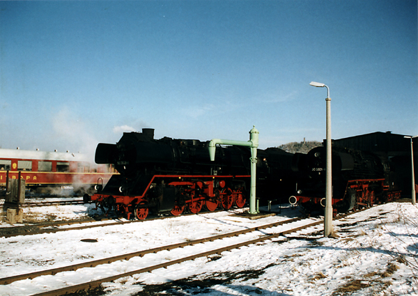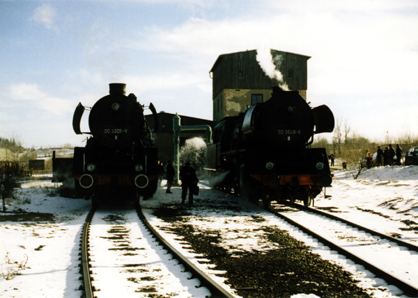Hier seht Ihr einige Szenen der regen Betriebsamkeit, die seit langem wieder einmal in Altenberg herrschte. An diesem Wochenende wurden die Wintersportzüge verstärkt, so daß neben den zwei Dampflokomotiven noch bis zu fünf V 100 am Lokschuppen anzutreffen waren.